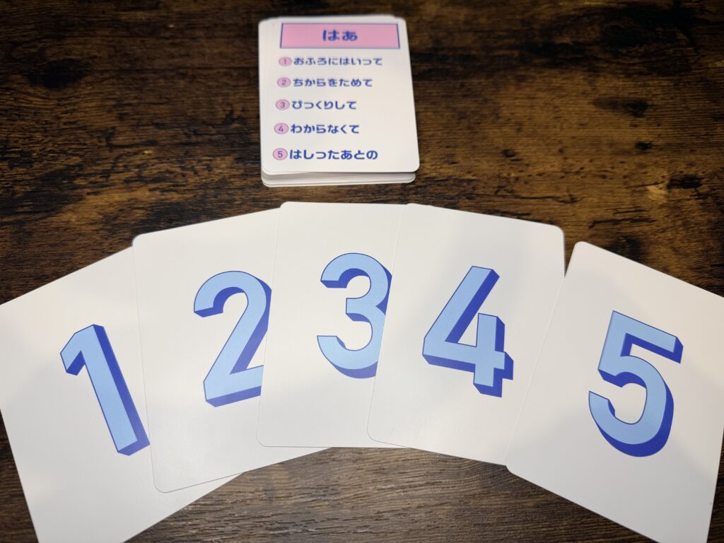 * すうじカード(5枚): どの番号の演技をするか、こっそり決めるために使います。