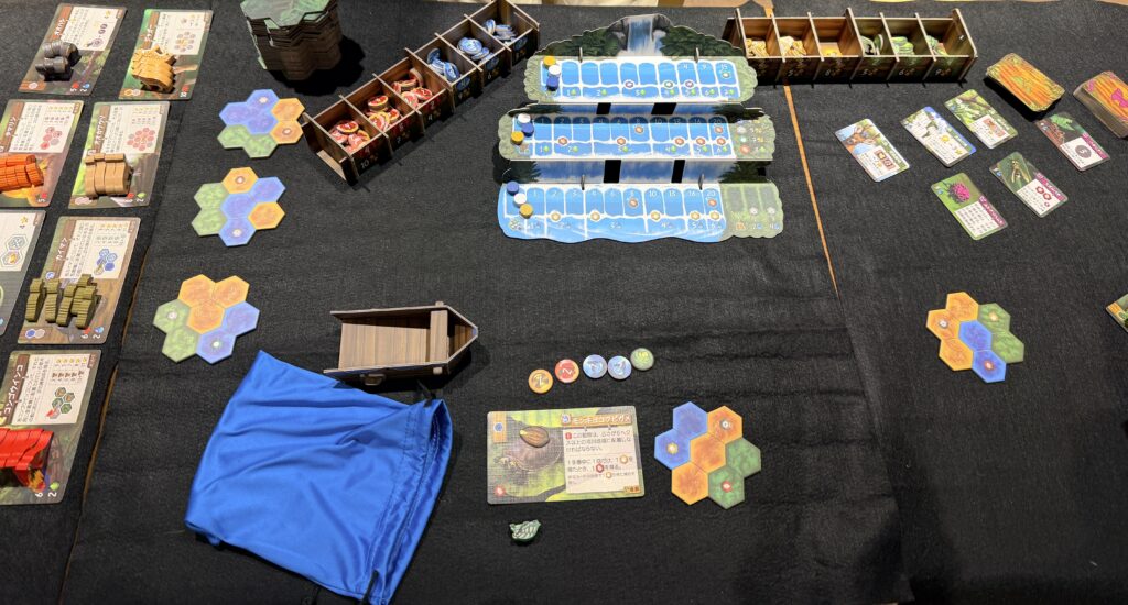 * プレイヤーの準備:各プレイヤーは自分のバッグと初期資源トークン(10個)を受け取ります。また、自分だけのジャングルの起点となる「初期地形タイル」と、秘密の目標となる「希少動物カード」を1枚選んで手元に置きます。