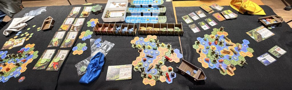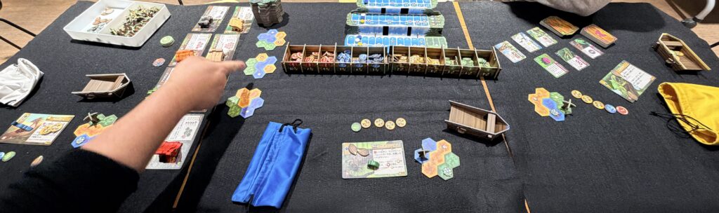 使わなかったトークンは貯蔵庫の分だけ残し、残りは捨て札(ボートの上)へ。その後、バッグから新しく5個引きます。バッグが空になったら、捨て札をすべてバッグに戻してシャッフルします。