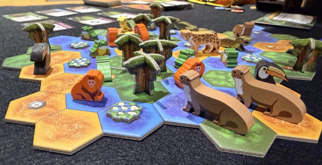* 共有エリアの準備:中央に「生命の滝」ボードを置き、滝を流れる資源トークンをセット。今回使用する8種類の基本動物を選び、その上に木製の動物コマを乗せます。地形タイルやカードも種類ごとに並べ、「プール(買い物場)」を作ります。